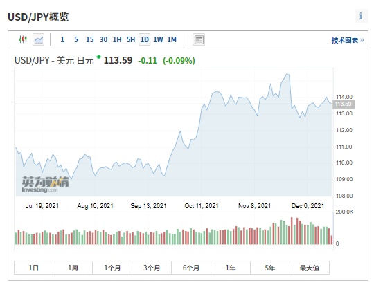 截至发稿,美元兑日元跌0.09%至113.59。据统计,2021年日元兑美元汇率下跌约9.5%,美联储明年加快缩债规模和加息预期可能会在2022年给日元带来进一步的下行压力。