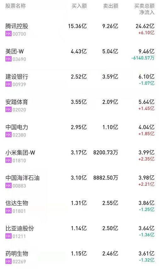 此外,中海油(00883)、安踏体育(02020)、美团-W(03690)分别获净买入2.2亿、1.12亿、7490万港元。而信达生物(01801)、药明生物(02269)、建设银行(00939)分别遭净卖出2.43亿、2.15亿、1.06亿港元。