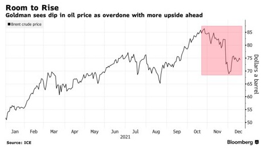 这一说法表明,即使油价今年已经上涨超过40%,高盛仍看好原油市场。该行认为,近期,由于对Omicron相关限制措施的不必要担忧,市场对原油的抛售过度了。该行预计,一旦资产管理公司明年重新配置资金,投资者将在油市逢低买入。