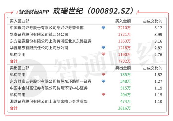 欢瑞世纪(000892.SZ):多主力现身龙虎榜,机构席位对倒净买入466万元,买一是知名游资赵老哥的席位买入2210万元,买四是知名游资的席位买入1217万元,当日净买入5732万元,该股近期非常强势,四连板后调整两天,今日再度涨停,预计走趋势为主。