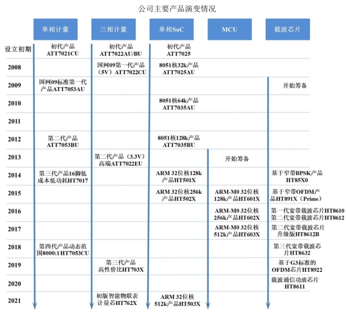 其中,电能计量芯片为公司最早推出的产品。自2008年发展至今,三相计量芯片、单相计量芯片和单相SoC芯片各类型产品均已经历四代以上的产品迭代。相比之下,智能电表MCU芯片和载波通信芯片推出时间较晚,其中MCU芯片自2017年后便未有新一代产品推出。