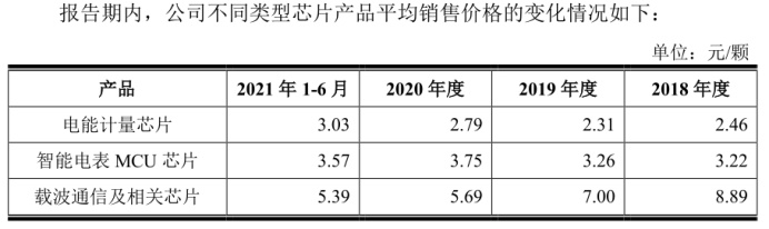 若从芯片产品单颗价值量来看,载波通信及相关芯片为公司单价最高的产品,但产品价格近年来下降显著。而电能计量芯片虽单价较低,但于近几年间售价出现可观增长。
