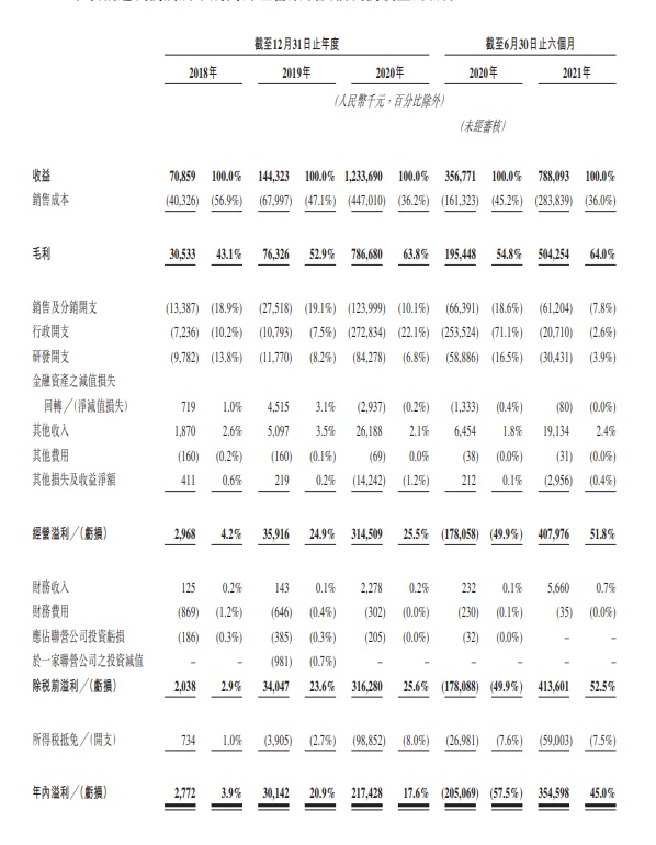 此外,截至2018年至2020年12月31日止年度,公司分别取得净利润277.2万元、3014.2万元、2.17亿元。截至2020年及2021年6月30日止6个月,分别取得净亏损2.05亿元及净利润3.55亿元。
