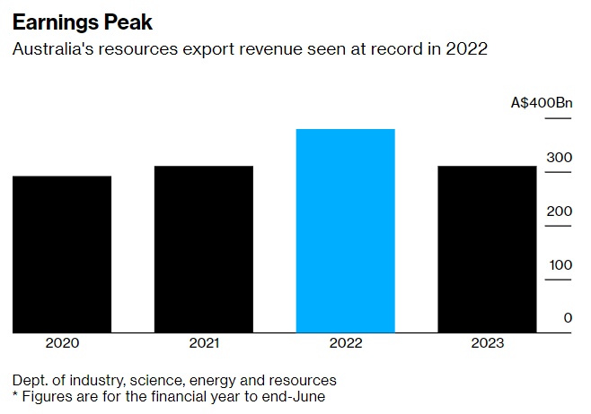 不过,今年可能是澳大利亚资源行业的高峰期,随着疫情后全球经济复苏开始减弱,该国对资源行业2023财年的营收预期降至3110亿澳元。