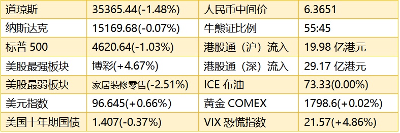1.上周五美股截至收盘,道指跌532.20点,跌幅1.48%,报35365.44点;纳指跌10.75点,跌幅0.07%,报15169.68点;标普500指数跌48.03点,跌幅1.03%,报4620.64点。上周道指下跌1.68%,标普500指数下跌1.94%,纳指下跌2.95%。港股ADR指数下跌,按比例计算,收报23139点,跌53.20点或0.23%。数位美联储高官发表讲话。美联储理事沃勒指出,在决定提前结束资产购买计划后,美联储可能最早在2022年3月15至16日会议上开始加息。