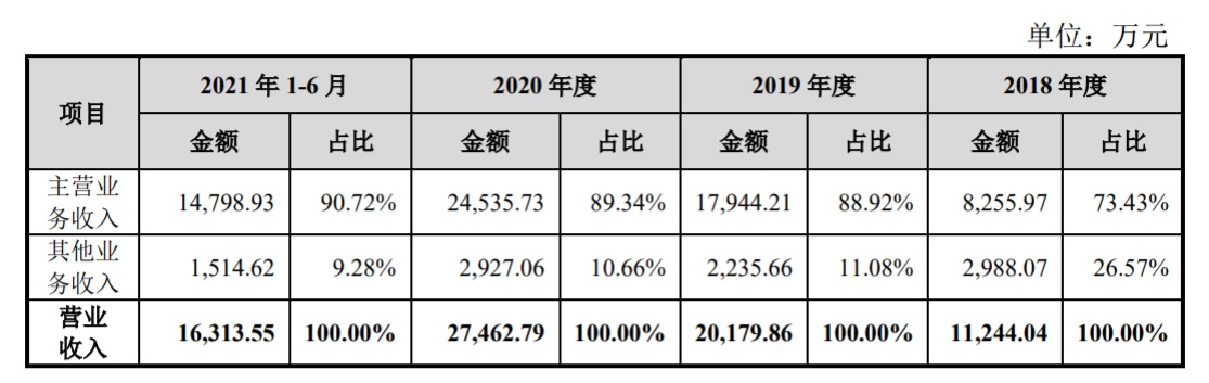 公司的发展也体现在其业绩上,2018年至今年前六个月,莱特光电的营业收入分别为1.12亿元、2.02亿元、2.75亿元以及1.63亿元;其中主营业务收入分别为8255.97万元、1.79亿元、2.45亿元以及1.48亿元,占比分别达到73.43%、88.92%、89.34%以及90.72%。