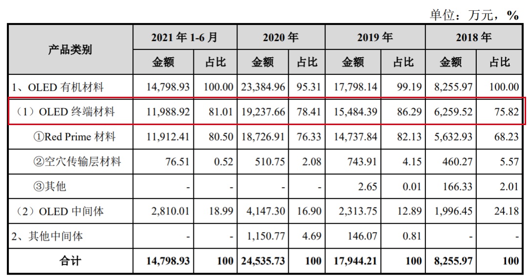 主营业务中的OLED有机材料收入占比最多,报告期内所占比例分别为100.00%、99.19%、95.31%、100.00%;其中,OLED 终端材料的收入分别为 6,259.52 万元、15,484.39 万元、19,237.66 万元及 11,988.92 万元,持续增长。