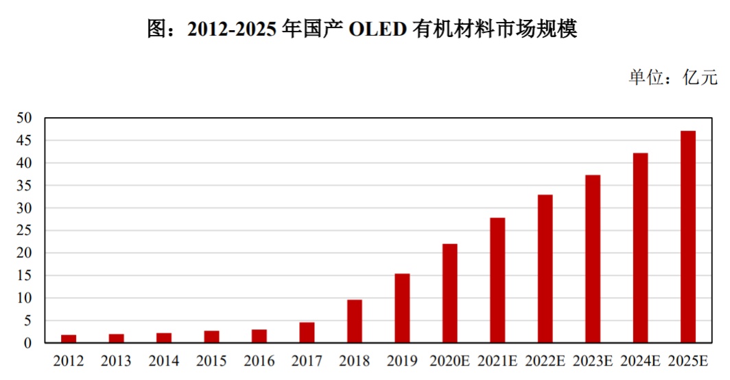 借助国内面板厂商不断提升的产能,国产OLED有机材料的需求也将继续维持增长。根据智研咨询的预计,2017年国产OLED有机材料的市场规模为4.6亿元,2019年增长至15.4亿元,达到234.78%的涨幅;未来国产OLED有机材料的市场规模将加速提升,预计2025年将达到47.1亿元。