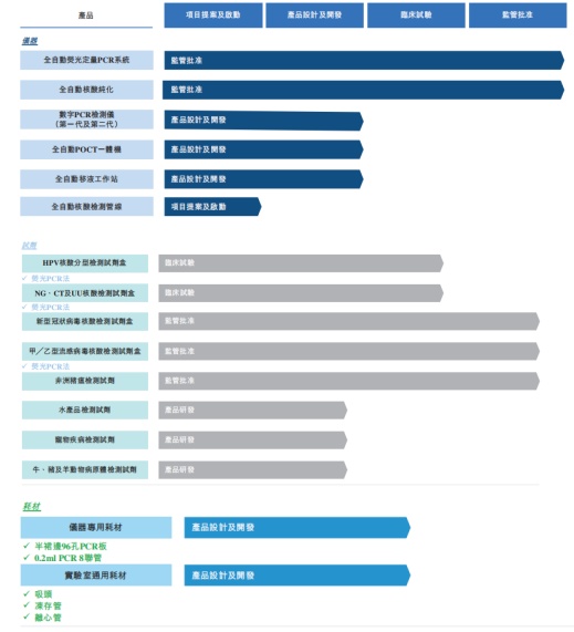 细分到具体产品上,目前该公司仪器设备中的全自动荧光定量PCR系统、全自动核酸纯化已获监管批准;试剂产品中的新型冠状病毒核酸检测试剂盒、甲╱乙型流感病毒核酸检测试剂盒及非洲猪瘟检测试剂获监管批准,HPV核酸分型检测试剂盒、NG、CT及UU核酸检测试剂盒通过临床试验;而耗材产品中仪器专用耗材和实验室通用耗材正处于产品设计及开发阶段。