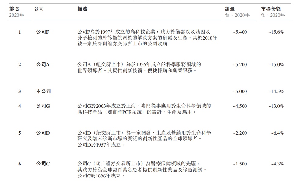 据灼识咨询报告,于2020年,该公司全球销量在国内PCR设备制造商中排名第一,市场份额为24.5%,国内销量则以14.5%的市场份额位居中国PCR设备市场的第三位。与此同时,该公司的海外销量在中国出口PCR设备的公司中排名第一,收益则以7.8%的市场份额位居中国PCR设备市场的第六位。