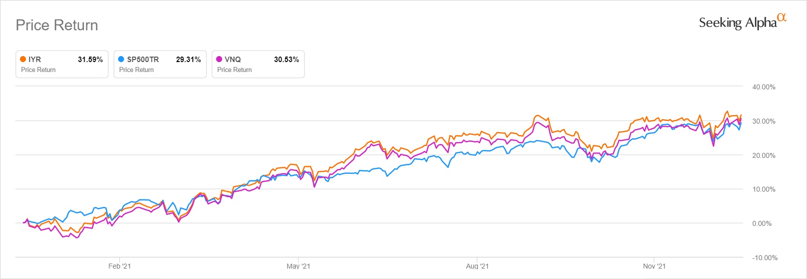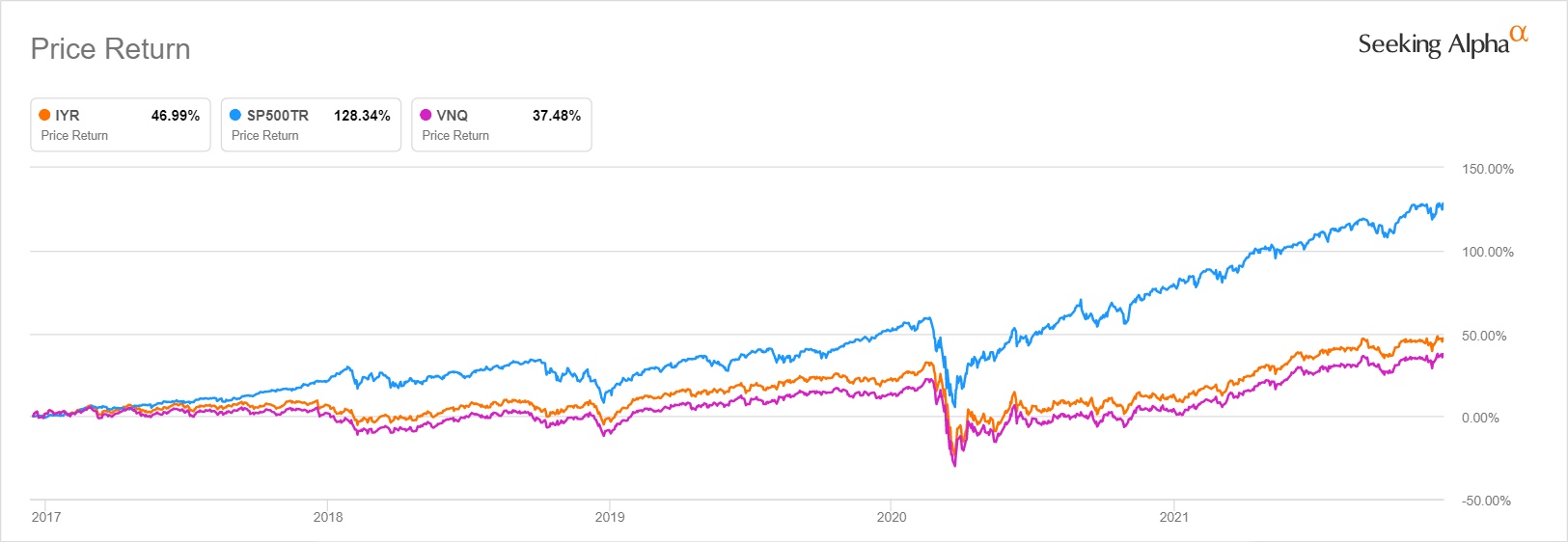 今年以来,美股两大REIT ETF:房地产指数ETF(IYR.US)与不动产信托指数ETF(VNQ.US)均跑赢标普500指数。但在过去五年中,标普500的总回报率遥遥领先这两只REIT ETF。