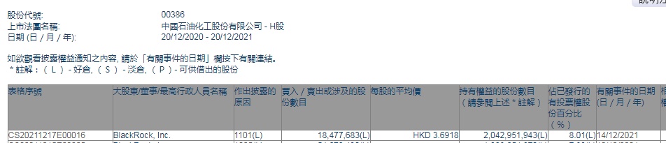 智通财经APP获悉,港交所最新资料显示,12月14日,贝莱德增持中石化(00386)1847.7683万股,每股作价3.6918港元,总金额约为6821.59万港元。增持后最新持股数目约为20.43亿股,最新持股比例为8.01%。