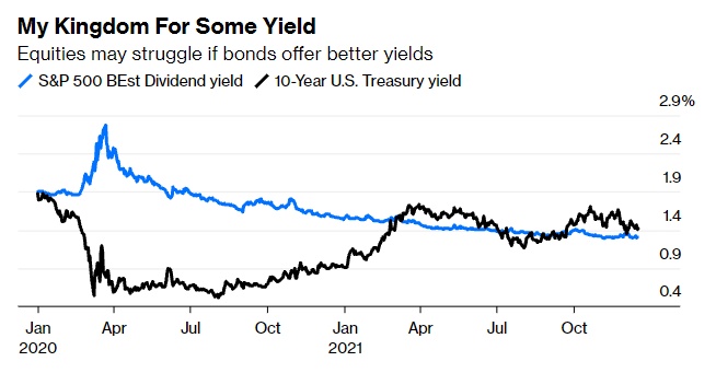 以前,政府债券对股市几乎构不成竞争,但这种情况正在发生变化。尽管美国国债在美联储转向鹰派政策期间一直保持平稳,但还是从疫情早期的低收益率开始稳步上升。