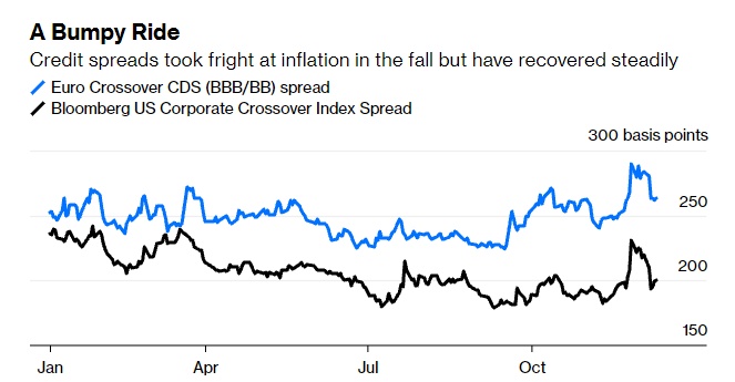 信用利差,即企业发行方提供的高于基准政府收益率的溢价,已恢复到疫情前稳步收紧的状态,但夏季后的通胀恐慌引发了一场重大震荡。尽管如此,经济背景已显著改善,因此,2022年的信用利差将是稳定的。美国国债利差的表现普遍好于欧洲,欧洲国债利差高于年初水平。