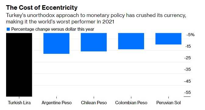 尽管土耳其的通胀率已飙升至21%以上,但该国央行几个月来已四次将基准利率下调至14%,使该国成为世界上实际负利率差最大的国家之一。里拉将迎来又一个糟糕的一年。
