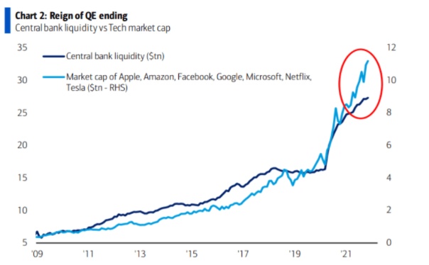 随着美联储加快缩减购债规模的步伐,以及其他央行采取强硬立场,Hartnett找出了13年的量化宽松牛市中受紧缩政策冲击的标的:债券——iShare iBoxx投资级公司债券指数ETF、iShare iBoxx高收益公司债券指数ETF,私募股权——PowerShare全球上市私募股权ETF,以及大型科技股——亚马逊(AMZN.US)、Meta Platforms(FB.US)、苹果(AAPL.US)、微软(MSFT.US)、英伟达(NVDA.US),奈飞(NFLX.US)、谷歌(GOOG.US)和特斯拉(TSLA.US)。