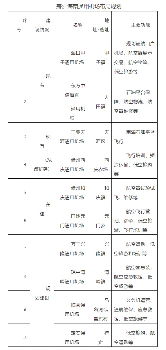 争取国家有关部委支持,优化海南民用机场管理方式,简化通用航空机场规划及报批建设审批流程。在全省现有4个通用机场基础上,新建白沙元门、儋州和庆(木排)、万宁、琼中、定安、临高通用机场,改扩建儋州西庆、三亚天涯通用机场。在自然灾害多发地区、高层建筑物楼顶、重要办公场所、重点医院、重要港口、南海岛礁、重点林区等区域建设起降点。争取到“十四五”末期,省内通用机场数量达到10个左右。