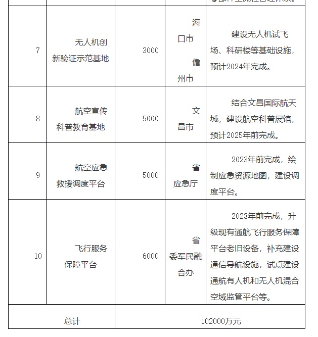 (七)无人机创新验证示范基地。在海口、儋州开展无人机以及电动垂直起降航空器相关新型航空器的研发、制造与试飞工作,探索新型航空器在城市物流、应急医疗配送、应急保障、城市空中交通、海岛巡防等场景的应用。