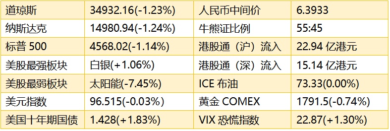 1.隔夜美股截至收盘,道指跌433.28点,跌幅1.23%,报34932.16点;纳指跌188.74点,跌幅1.24%,报14980.94点;标普500指数跌52.62点,跌幅1.14%,报4568.02点。奥密克戎毒株疫情加剧带动市场负面情绪升温,美股道指周一曾急泻700点。港股ADR指数下跌,按比例计算,收报22686点,跌57.59点或0.25%。