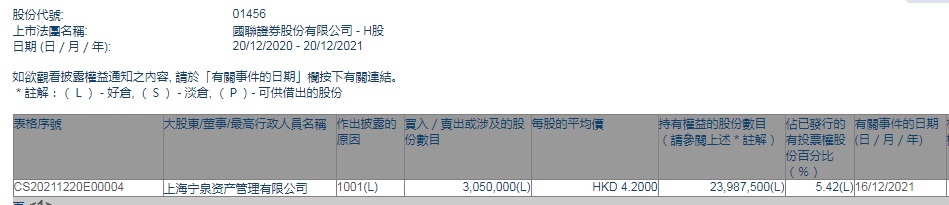 智通财经APP获悉,香港联交所最新资料显示,12月16日,上海宁泉资产管理有限公司增持国联证券(01456)305万股,每股作价4.2港元,总金额为1281万港元。增持后最新持股数目为2398.75万股,最新持股比例为5.42%。