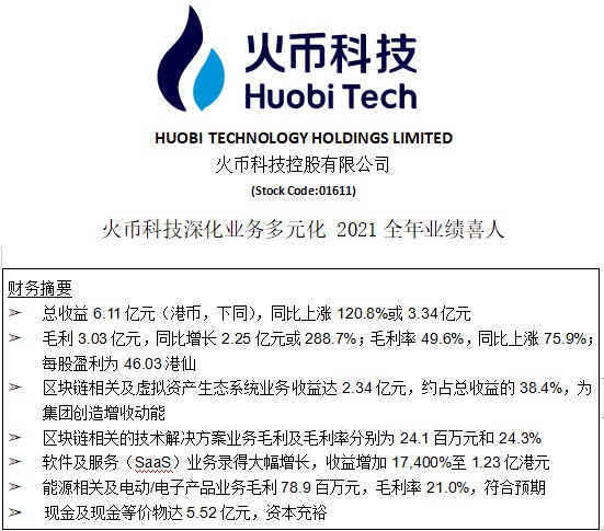 智通财经APP获悉,2021年12月21日,火币科技控股有限公司(火币科技,01611)公布公司及其附属公司截至2021年9月30日(统称「报告期内」)止之全年业绩。尽管2021年全球供应链中断、大宗商品价格上行对各行业造成了一定影响,集团通过精益管理和控本增效,业务加速多元化拓展,于报告期内取得出色成绩。