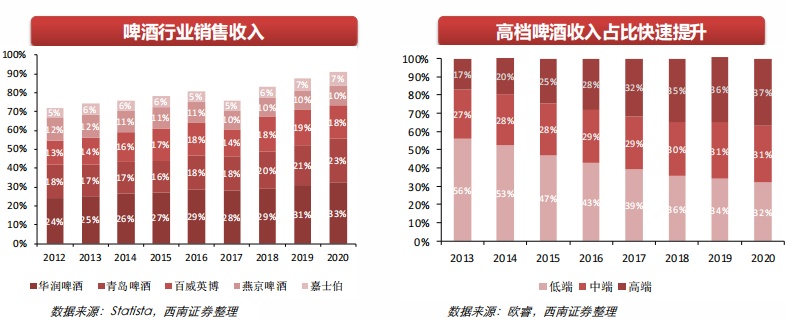 高端化成为行业共识,啤酒步入发展新阶段。在行业利润率持续低下、低端啤酒消费下滑、进口啤酒连年高增等因素共振下,行业由规模导向向利润导向转变,产品结构升级成为行业主线逻辑。根据欧睿数据,中高档啤酒收入占比从2011年38%上升至2020年68%,中高端市场迅速扩容