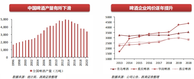 量:受消费者健康意识觉醒、其他低度酒精饮料兴起等多种因素影响,中国啤酒产量自2013年达到历史顶峰4983万吨后开始逐年下滑,行业步入成熟期。对标海外,美国啤酒行业自1980年进入成熟期后,行业增速长期维持在低个位数水平,国内啤酒量增乏力已成定局。