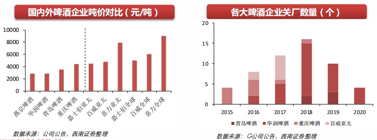结构升级:与海外啤酒龙头平均6000元/吨水平相比,国内啤酒企业20年平均3500元/吨水平尚有接近翻倍增长空间。各大龙头目前加速推进高端啤酒品牌建设(华润4+4矩阵;重啤6+6矩阵)以满足消费者差异化需求,此外费用投放重心由渠道抢占转向品牌建设,行业结构升级如火如荼。
