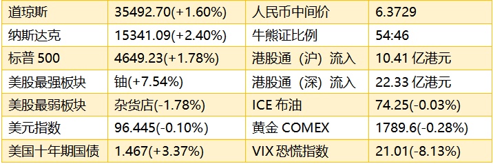 1.隔夜美股截至收盘,道指大涨560.54点,涨幅1.6%,报35492.7点;纳指涨360.14点,涨幅2.4%,报15341.09点;标普500指数涨81.21点,涨幅1.78%,报4649.23点。值得注意的是美股半导体板块大涨,因美光科技(MU.US)业绩前景强劲。港股ADR指数上涨,按比例计算,收报23258点,升286.66点或1.23%。