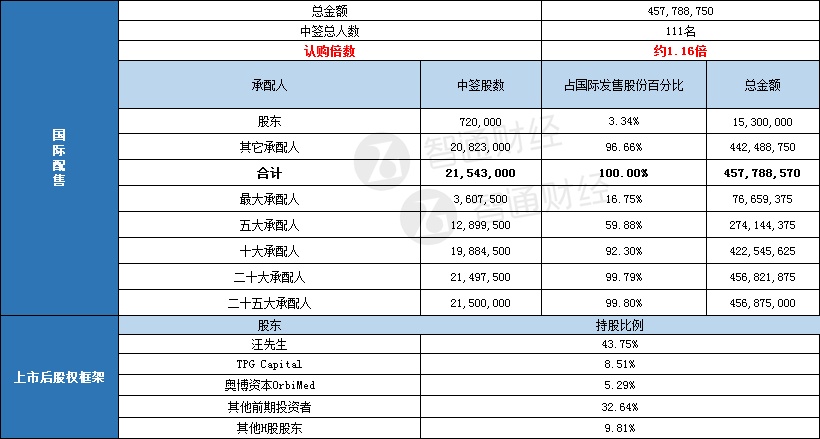 国际配售中签总人数111名,认购倍数约1.16倍。