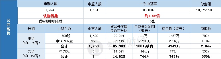 其中,公开配售申购人数1994人,一手中签率85%,认购倍数约1.52倍。