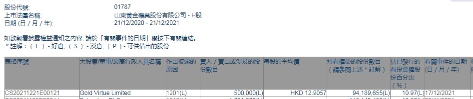 智通财经APP获悉,香港联交所最新资料显示,12月17日,Gold Virtue Limited减持山东黄金(01787)50万股,每股作价12.9057港元,总金额约为645.29万港元。减持后最新持股数目约为9418.97万股,最新持股比例为10.97%。