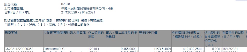 PLC减持中国财险(02328)945.6万股,每股作价6.4891港元,总金额约为6136.09万港元。减持后最新持股数目约为4.12亿股,最新持股比例为5.98%。