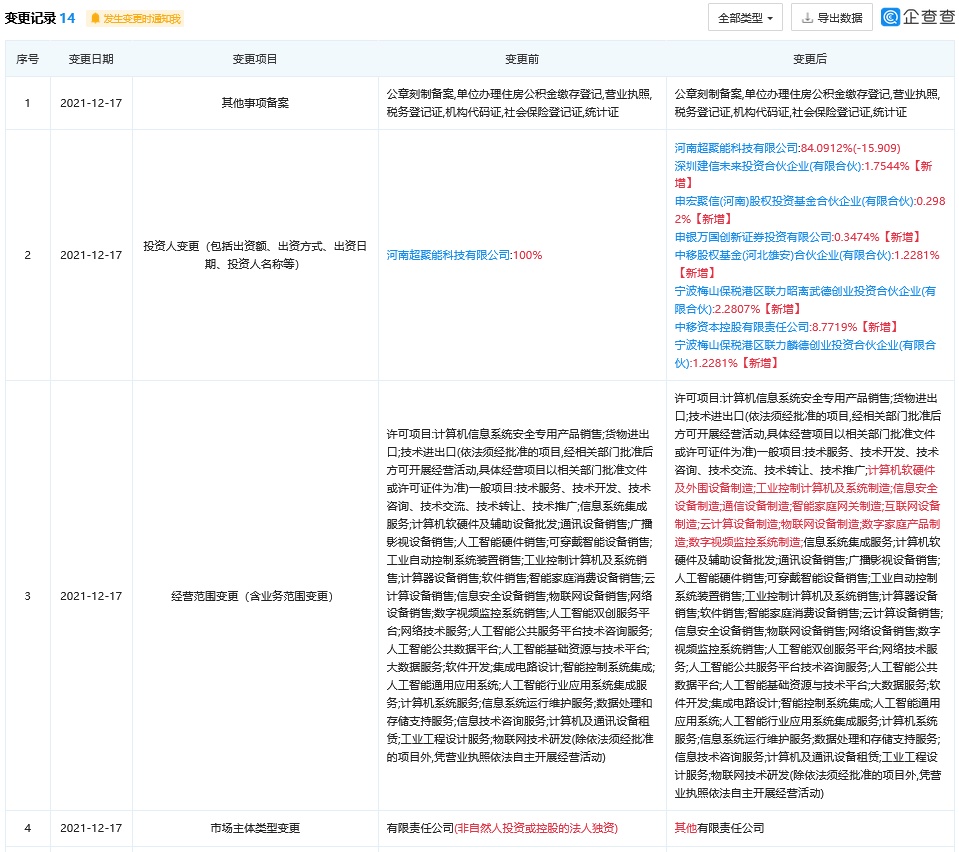智通财经APP获悉,企查查App显示,近日,超聚变数字技术有限公司发生工商变更,股东新增中国移动子公司中移资本控股有限责任公司、中移股权基金(河北雄安)合伙企业(有限合伙)等;经营范围新增信息安全设备制造;通信设备制造等。