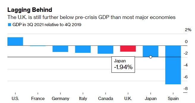 由于供应链持续紧张和新冠病例激增,消费者不再光顾商店和餐馆,预计本季度的增长将放缓。如果英国宣布新的限制措施,该国经济可能会在2022年的前几个月出现萎缩。