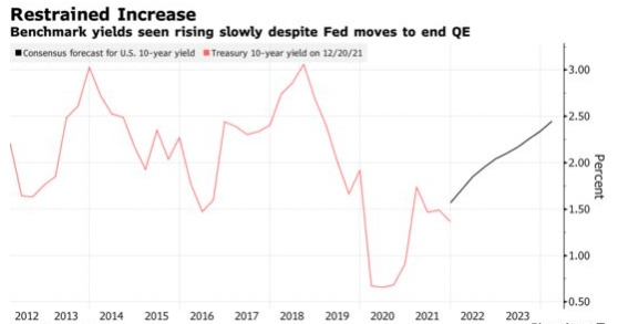 不过,媒体对策略师的调查得出的加权平均预测是,到2022年底,10年期美国国债收益率将上升60个基点,略高于2%。德国10年期国债收益率预计将上升约50个基点,至0.08%;而类似期限的日本国债预计将小幅上升不到10个基点,至0.13%。预计日本和德国明年的通胀率都将远低于美国。