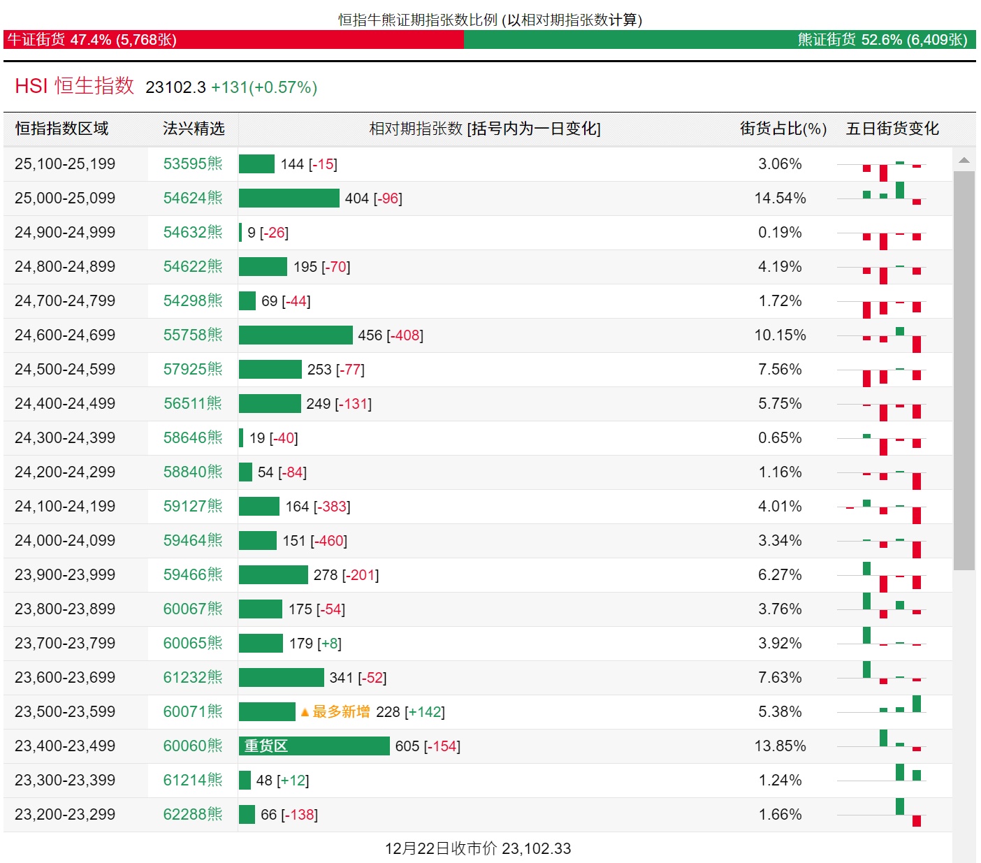 智通财经APP获悉,截至12月23日,恒指最新的牛熊街货比例为47:53。