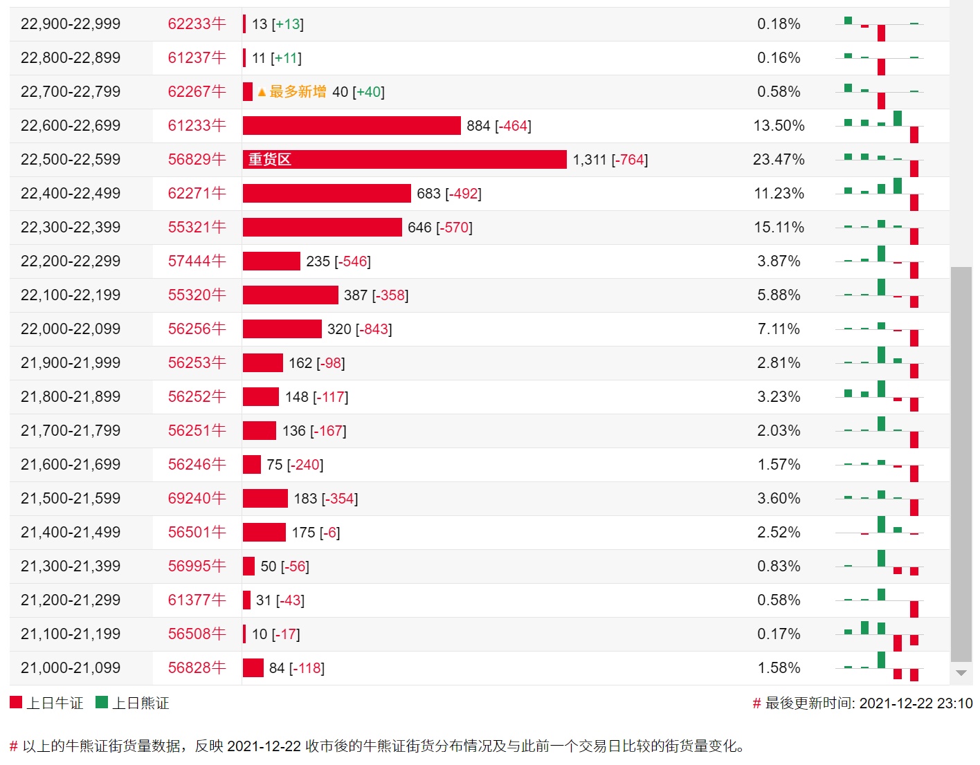 牛证街货重货区在22500-22599区间,该区间最新牛证数量为1311张,较上一交易减少764张;最多新增在22700-22799区间,该区间最新牛证数量为40张,较上一交易日增加40张。