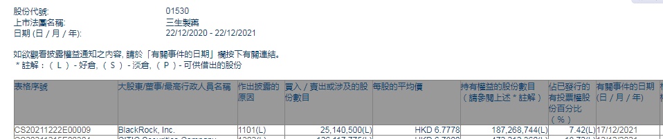 智通财经APP获悉,香港联交所最新资料显示,12月17日,贝莱德增持三生制药(01530)2514.05万股,每股作价6.7778港元,总金额约为1.7亿港元。增持后最新持股数目约为1.87亿股,最新持股比例为7.42%。