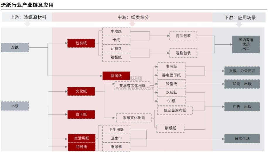 具体而言,在造纸行业产业链条中,纸浆位于行业上游,主要废纸浆和木材制成的木浆;造纸企业通过纸浆制成的各种纸(包装纸、新闻纸、文化纸、白卡纸、生活用纸等)则位于行业中游;而行业下游则是指一些应用场景,比如印刷、出版、日常生活等。