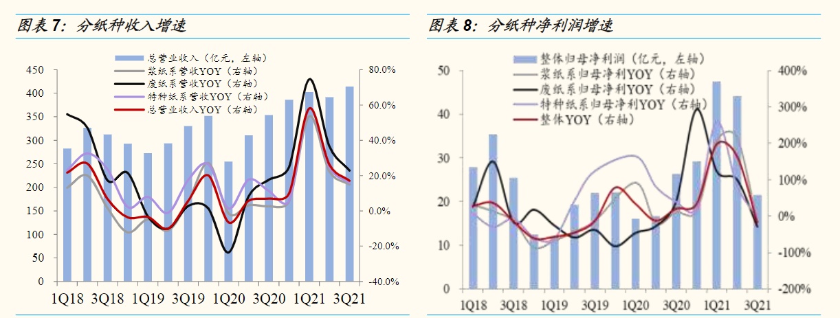 供给端来看,“双控”政策影响产量,叠加原辅料成本上涨(纸价上涨主要因素),推动纸价上涨;需求端来看,“双11”带动快递包装等下游需求,进一步拉动了上游纸企涨价。因此,受原辅料价格上涨影响,造纸企业压力增加,2021年Q3业绩增速较前两季度有所下滑。