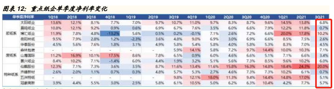 与此同时,受低价库存浆耗尽,原料综合成本抬升的影响,头部纸企的盈利能力边际下滑:据相关财务数据披露,2021年Q3,太阳纸业、晨鸣纸业、山鹰国际这几大头部纸企的净利率分别为6.8%、0.7%、3.4%,皆处于近三年历史低位。