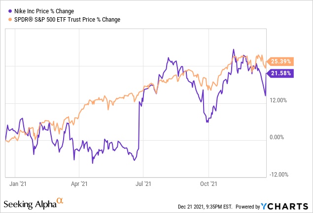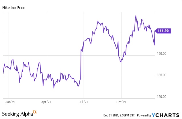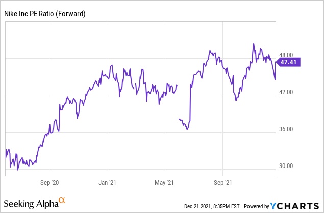 该公司面临的最大风险仍然是潜在的供应链问题和与疫情相关的封锁。如果世界回到2020年那种封锁状态,这可能会影响耐克向消费者交付产品的能力。此外,如果供应链问题恶化,这可能会导致投入成本增加,如货运/运输和销售下降。此外,相对于潜在的定价权,高通胀对工资的影响更大,从而对毛利率构成压力。估值仍处于溢价水平,如果该公司的品牌形象和财务增长状况减弱,这可能会导致市盈率和股价收缩。