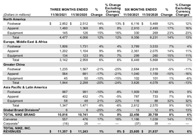从历史上看,大中华区和亚太及拉美地区是耐克增长最快的地区之一。鉴于影响这些地区的供应链限制,最近几个季度的收入增长明显放缓。