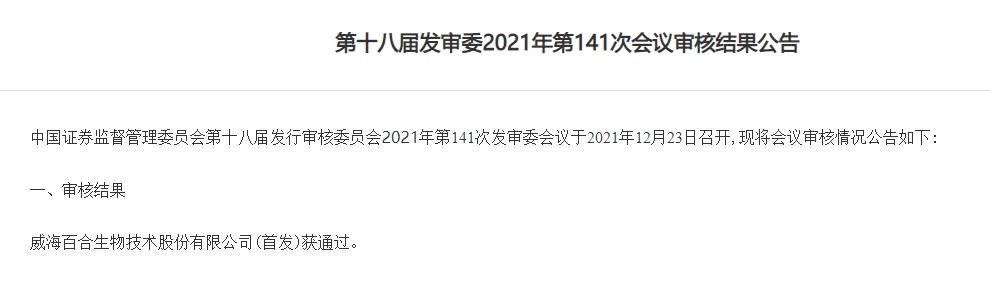 智通财经APP获悉,证监会12月23日公布第十八届发审委2021年第141次会议审核结果公告,威海百合生物技术股份有限公司(首发)获通过。
