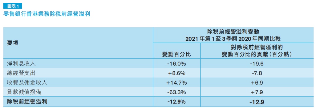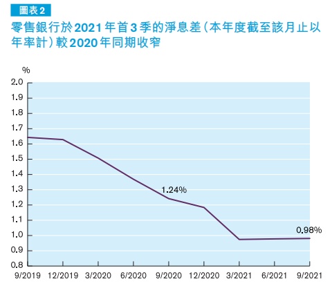 盈利方面,低息环境持续,对银行盈利构成压力。零售银行整体除税前经营溢利在首3季按年减少12.9%(图表1),主要原因是净息差收窄导致净利息收入减少(图表2),但部分跌幅被佣金收入增加及贷款减值拨备减少所抵销。