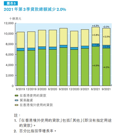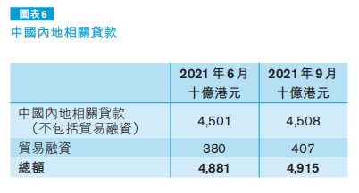 资产负债表趋势方面,银行业贷款总额在2021年第3季减少2.0%(图表5),主要受到6月底的首次公开招股活动产生的高基数效应影响。按本年度截至该月止的基础计算,贷款总额在 2021 年首 9 个月增长5.0%。于2021年第3季,贷款总额当中在香港使用的贷款减少4.2%,在中国香港境外使用的贷款及贸易融资则分别增加2.0%及5.5%。中国内地相关贷款在2021年第3季增加0.7%至49,150亿港元(占资产总额的16.5%)(图表6)。