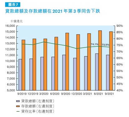 银行业存款总额在2021年第3季减少1.2%(图表7),其中港元存款减少4.9%,同样是主要受到6月底的首次公开招股活动产生的高基数效应影响。按本年度截至该月止的基础计算,存款总额及港元存款在2021年首9个月分别增加3.4%及2.3%。期内波幅属正常范围。