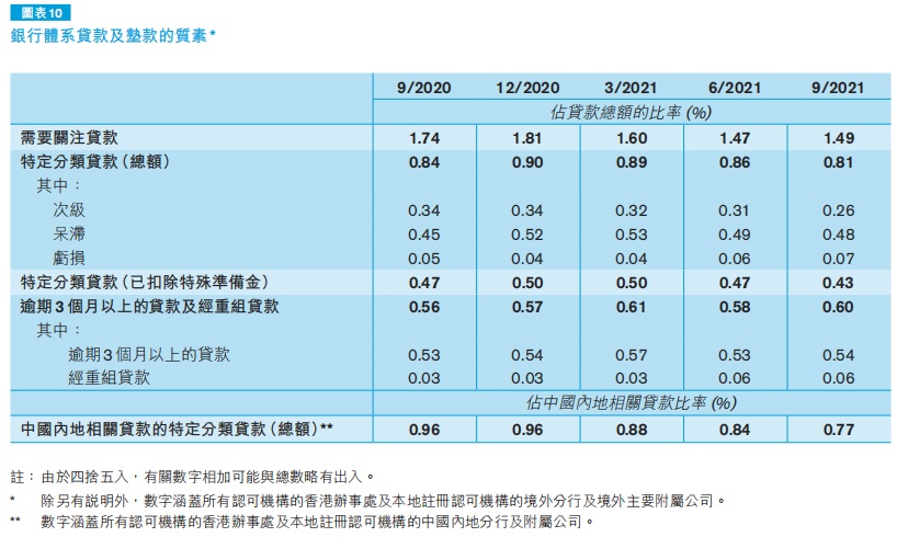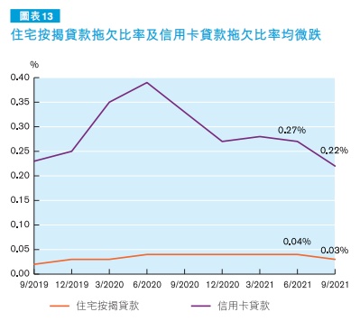 贷款质素、流动性状况及资本充足水平方面,银行体系的特定分类贷款比率由上一季的0.86%进一步下降至第3季末的0.81%。中国内地相关贷款的特定分类贷款比率亦由2021年6月底的0.84%下降至9月底的0.77%(图表10)。同期,信用卡贷款拖欠比率及住宅按揭贷款拖欠比率分别降至0.22%及0.03%(图表13)。