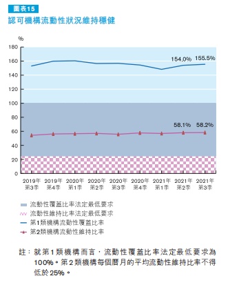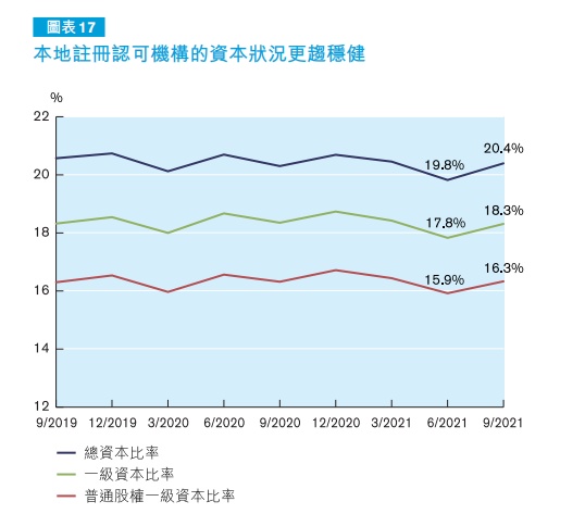 银行体系的流动性及资本维持充裕。第1类机构的 平 均 流 动 性 覆 盖 比 率 在 2021 年 第 3 季 为155.5%,远高于100%的法定最低要求(图表15)。本地注册认可机构的总资本比率在2021年9月底为20.4%(图表17),远高于8%的国际最低要求。